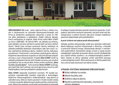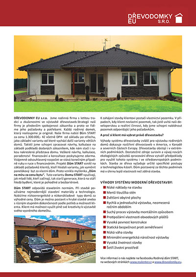 Firma Dřevodomky EU s.r.o. vznikla jako specializovaná firma zaměřená na výstavbu rodinných domů za použití materiálů suché výstavby, rychlosti výstavby a v neposlední řadě garanci dodržení kalkulované částky a termínu výstavby.